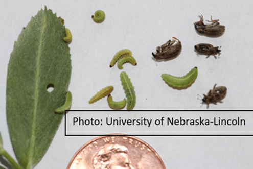 - Identification: The pale-green larvae have black heads and tend to feed on the young growth at the top of the plants. Adults, found after 800 GDUs, are gray beetles with small snouts.