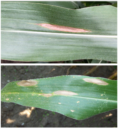 Lesions of NCLB can first be found on lower leaves of the corn plant and will progress up the plant. Lesions are one to six inches long, elliptical or cigar shaped, and are grey or tan. Spores can be seen in the lesions which can give the lesion a grey or dirty appearance.