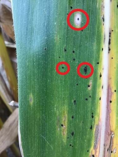Small black spots that occur on the top or bottom of a corn leaf that cannot be removed through rubbing or scraping the spot. These spots called “stromata” can be found on leaves, stalks, and husks of corn plants. Tar spot infection can begin on any part of the corn plant. It was originally thought to start at the lower part of the plant, but it has been noted to start at the top of the corn plant as well.