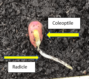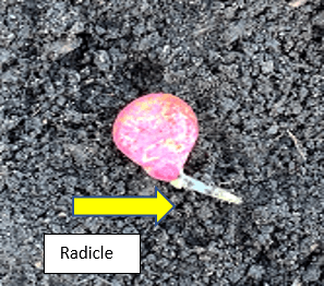 Once germination has initiated, the radicle root will start to emerge, it normally takes 30 to 40 GDUs for the radicle root to emerge. (This is shown in the photo above and on the right). The radical always emerges from the tip of the embryo and will orient itself due to gravity so it is growing down, regardless of where the embryo of the seed is pointed. The ability of the plant to sense gravity is called Gravitropism or Geotropism.