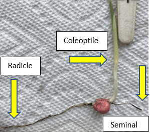 The next process is for the coleoptile to emerge from the seed (as shown below and on the left). It normally takes 50 to 60 GDUs for the coleoptile to emerge from the seed. Starting between 60 to 70 GDUs, the seminal root system will start to emerge from the seed and almost immediately start taking in water and nutrients for the plant to continue to grow. The seminal root system and the radicle will anchor the plant and act as the main root system for the plant until VE (shoot/spike coleoptile emergence) and will continue to grow until V3 (three-collared corn).