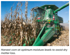 - Harvesting at optimum moisture levels will minimize dry matter losses and kernel damage.