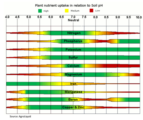 Soil pH: Soil pH determines nutrient availability to the crop and influences biology in the soil. If the soil pH is off, there could be ample amounts of a nutrient in the soil but still unavailable to the plant. pH measures the acidity or alkalinity of soil. The pH scale is logarithmic, so a pH of 5 has a concentration of H+ that is 10x higher than a pH of 6. The target pH for most crops is about 6.5, with alfalfa being closer to 6.8-7.0. Below is a chart showing nutrient availability at each pH.
