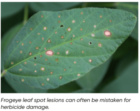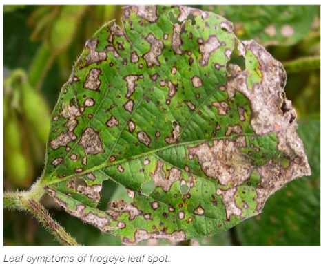 Frogeye leaf spot is a soybean disease that is common in the southern corn belt and can move into the central corn belt on storm fronts from the south. Frogeye infection first appears on leaves in small circular lesions, the lesions will have a dark center which is surrounded by reddish brown margins with a yellow halo. As the disease progresses, the lesions will coalesce or join to form larger lesions. Late-stage infection will also spread to pods which can leach to the seed and cause splotches on the soybean seed. Infection is favored by warm humid conditions, and dry weather will limit disease development.