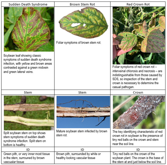 As soybeans enter the full pod (R4) beginning seed (R5) and possibly later, there are several late season diseases that may start appearing. The big three are Sudden Death Syndrome (SDS), Brown Stem Rot (BSR), and Sclerotinia White Mold (SWM). Red Crown Rot is an additional disease to keep an eye out for this year.