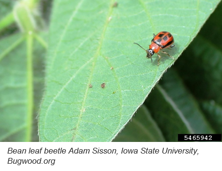 While the crop progresses into maturity and scouting continues, some folks are noticing late season insect feeding. Second generation bean leaf beetles are showing up in some areas and causing concern. These beetles can feed until the soybean plant senesces, or begins to turn, and the biggest concern is feeding on the pods. Feeding damage to the soybean pod allows for water and pathogens to enter the seed pod and cause damage to the seed inside. If later planted soybeans are still in the R5 stage (seed 1/8 inch long in a pod on one of the top 4 nodes) and 10-15 percent of pods show signs of feeding with active beetles in the field, control may be warranted.