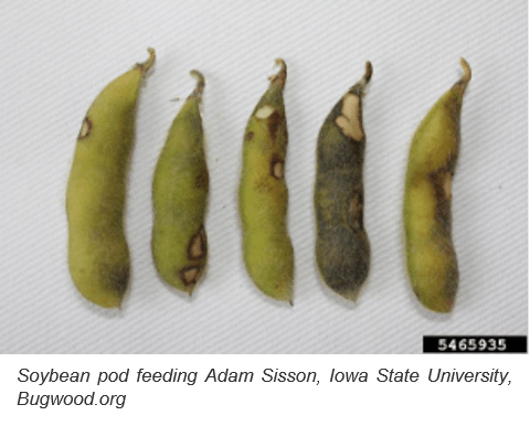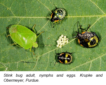 Stink bugs have been observed in some fields as well. Stink bugs can feed on pods and cause seeds to be small and shriveled. Threshold for stink bug control is 4 stink bug adults, nymphs or both in 10 sweeps of a sweep net across 3-5 locations in a field. Similar to bean leaf beetle, most soybeans are far enough along in mantuary that control is not cost effective, but later planted soybeans may be a different story. If you have any questions contact your local Dairyland DSM or Regional Agronomist.