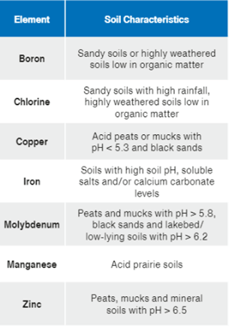 If micronutrient deficiencies are noted year after year, and verified with soil and tissue samples, then a fertility plan can be put in place to ensure that the given deficiency does not continue to be a yield limiting factor. An example solution is the addition of zinc in a band of fertilizer when planting corn, often in 2x2, to ensure that the crop has enough for the season or at least to get started. All solutions are not this easy when looking to correct nutrient deficiencies, but there are many viable options. Examples of soils where certain micronutrient deficiencies may be found are shown in the table below.