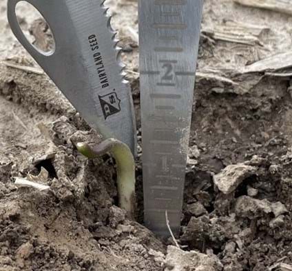 In the case of soybeans, if the plant has emerged and the cotyledons are out, or even just the hypocotyl is exposed, soil particles can “blast” away at the tissue and cut the plant in two, killing the plant. (As shown in the photo below.)