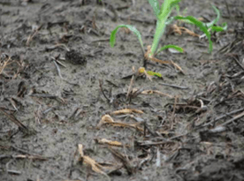 Pythium is a water mold that survives in the soil and plant debris and is typically only a concern in high soil moisture levels. These wet soils provide a pathway for the disease to move about and then find its way to the corn root system. Pythium is one of the first diseases to attack corn in the spring and typically is active in 50-60°F soils; however, some of the species of this disease are active under a wide range of temperatures. Pythium can infect and attack plants from seeding well into the growing season. Symptoms include darker and or slimy/greasy lesions on the root or mesocotyl which may cause them to shrivel. Pythium can also attack the seed.