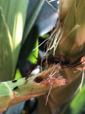 Figure 2 shows fresh feeding on silks and it could affect pollen transfer if pollination has not occurred. Typically for silk feeding to be of significance, it will need to be within a half inch of the husk and four to five corn rootworm beetles per plant. In the case of Japanese beetles, it would be three beetles per plant.