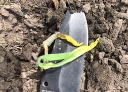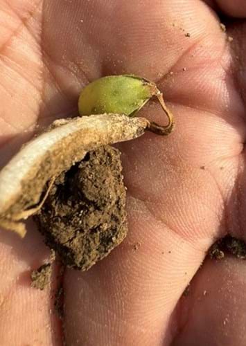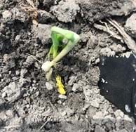 If soil conditions are a little too wet during planting, then you can see some soil crusting where wheel tracks run over the row. However, soil crusting is more likely to occur after a heavy rain and if the weather turns hot and windy. This dries the soil rapidly and creates a thick crust on the top layer, making emergence much harder for the seedling. Corn seedlings that are struggling to emerge can have deformed mesocotyl elongation and leafing out underground. The corn plant can also partially leaf out underground and emerge with tightly rolled leaves (Figure 3). Soybeans emerge by pushing up with the hypocotyl that carries the cotyledons to the surface. When soybeans experience soil crusting the hypocotyls become swollen and can break off while trying to push through the crust. Swollen hypocotyls can result in a weak plant and broken hypocotyls result in plant death (Figure 4).