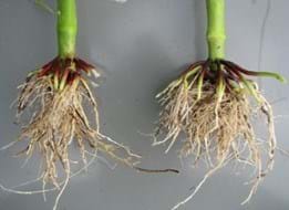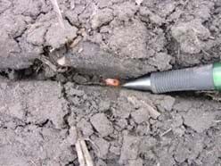 Figure 1. (Left) Soil that was too wet to plant, leaving the seed trench open and the seed exposed. (Right) Sidewall compaction restricting nodal root growth. Note the roots of the corn plant are running horizontally along the seed trench.