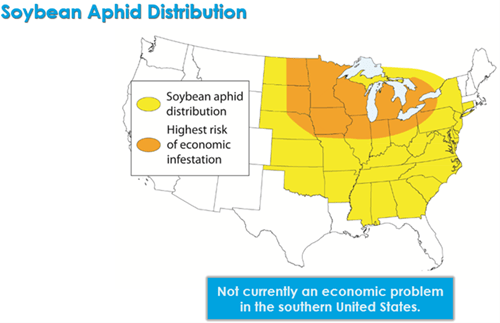 The soybean aphid (Aphis glycines) is a native of Asia and was first documented in North America in Wisconsin in July 2000. Since, it has spread to nearly all soybean producing states. The highest risk for economic yield loss occurs in all states within the Dairyland Seed footprint, where cooler northern temperatures and adequate moisture can sustain rapid aphid development. In addition to geographical considerations, soybean fields at highest risk include those planted late and those that experience hot, dry weather that stresses the crop.