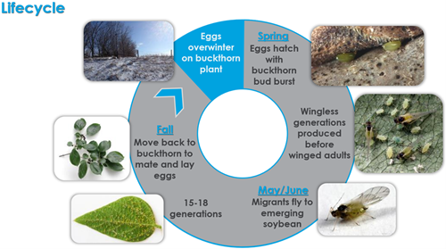 To understand how to scout for damage and manage soybean aphid infestation, it is important to understand its lifecycle. The soybean aphid alternates between a winter and summer host. Eggs overwinter on the buckthorn plant and egg hatch is synchronized with buckthorn bud burst in the spring. A few wingless generations are produced before winged adults are formed. Then, spring migrants fly to emerging soybean fields during May and June. Depending upon temperature and moisture, 15 to 18 generations are possible on soybean. During the summer, there is a mixture of wingless and winged adults. Aphid crowding, plant quality, and the presence of natural enemies may prompt winged aphids to be formed. Long distance migration can occur because the aphids move with jet streams. As soybeans mature and day length decreases, winged soybean aphids move back to buckthorn plants to mate and in the fall, deposit eggs, which overwinter. Nymphs and adults feed on plant sap in the phloem of all above-ground plant parts, which removes plant nutrients.