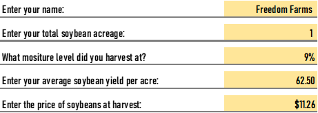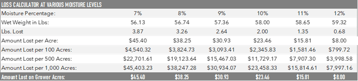 The table below shows the revenue per acre lost when combining soybeans in situations where the moisture starts to drop below 13 percent. The table shows revenue lost on 1 acre to 1000 acres. The average yield and value per bushel used was 62.5 bushel and $11.26/acre also shown in the table below.