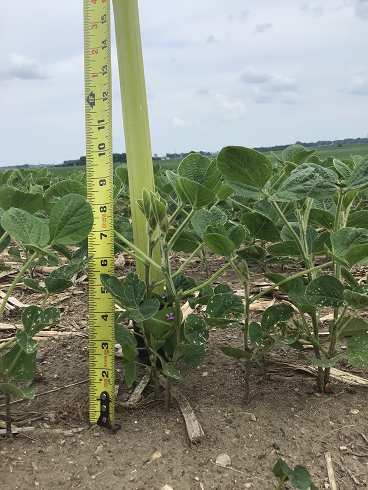 Soybean plant development is ranging from just germinating for replanted soybeans (due to drowned out or other weather impacted areas) or a second crop after peas or winter wheat, to beginning bloom (R1 which is an open flower on any node on the main stem.) Typically, we find that soybean plants are ankle to calf high (4 to 16 inches) by the 4th of July. We may have some early planted and/or early maturing soybeans that are at full bloom (R2 -- an open flower at one of the two uppermost nodes on the main stem that have a fully developed leaf.)