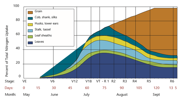 The corn plant needs adequate amounts of available nitrogen at critical growth stages. Figure 1 shows the growth stages and the percent of total nitrogen uptake. About 5-10% of total nitrogen is taken up from emergence to about V6. The plant uses about 20% of total nitrogen from about V6-V12 and about 35% post tassel. The remaining 35-40% is taken up around R2-R6. Not having enough nitrogen available at critical timings, especially after tasseling, can result in yield reductions.