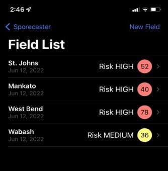 Keep in mind that proper timing and proper application is crucial when using a fungicide for white mold control. The most effective fungicide timing is at R1 (first flower) but some affect can still be seen up to R3 (beginning pod). However, once white mold symptoms are apparent, fungicides will not be effective. Since timing is so critical, modeling tools like Sporecaster, have been developed to predict the apothecia (fruiting body that shoots spores) risk. Sporecaster is a free phone application that combines field information with research-based models to predict the best time for white mold treatment. If there is a risk factor above 40 percent during flowering, then a fungicide application should be considered.