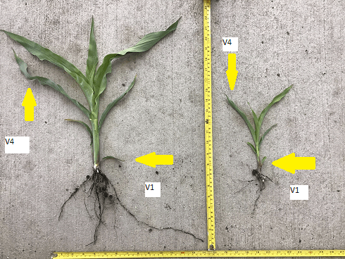 Another reason to choose growth stages over height in making decisions is that different hybrids and/or genetic bases grow or put on height at different rates and can reach the same growth stage with different heights. Or, as in the case of the photo above, due to field growing conditions these two corn plants planted on the same day, in the same field with the same hybrid, are at the same growth stage, V4 but are vastly different heights.